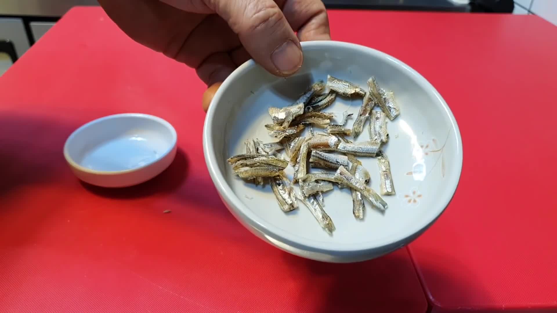 - 물 3컵에 멸치 10마리, 다시마 5×5cm 한 장을 넣고 중불에서 10분간 끓입니다.