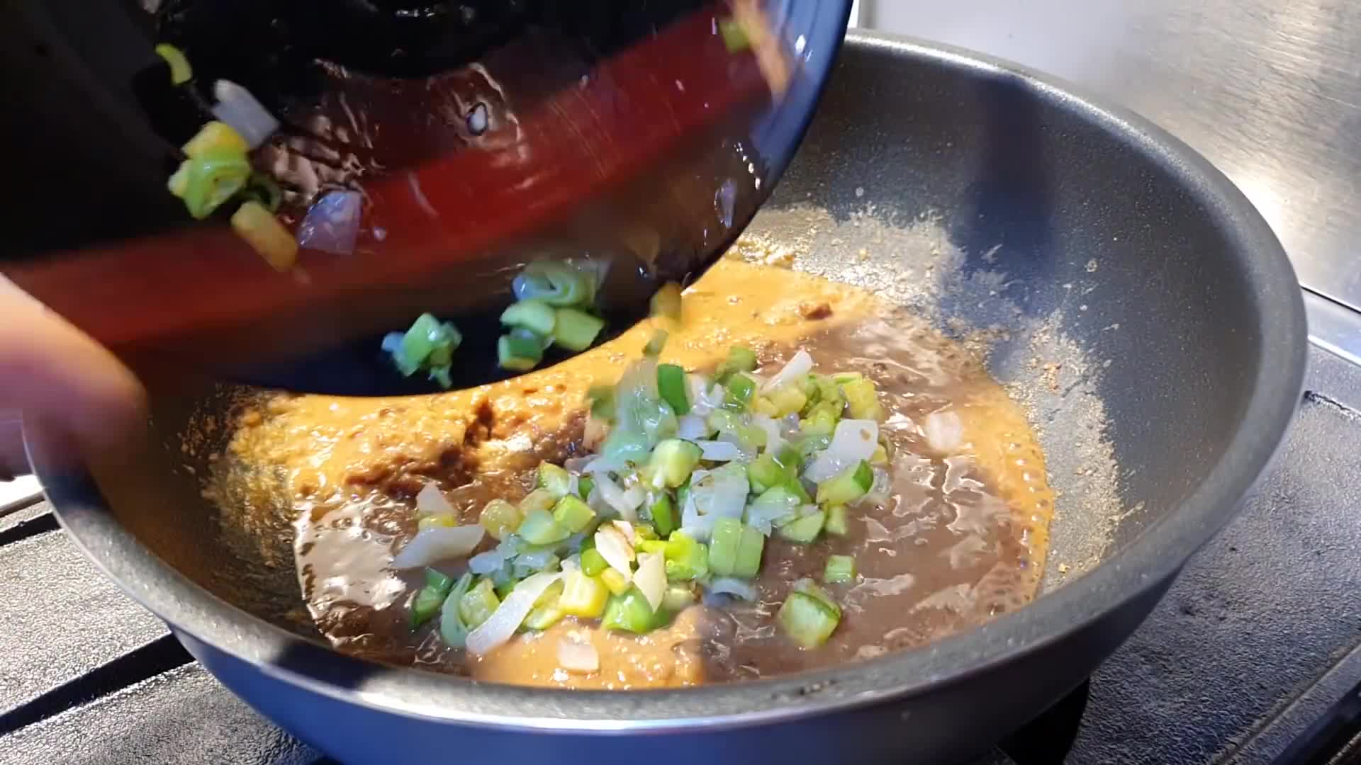 - 차돌박이 100g을 별도로 팬에 살짝 볶아 기름을 뺀 후, 된장국물이 끓을 때 넣어줍니다.